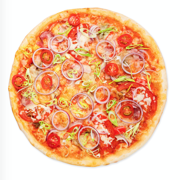 Mozzarella, Thunfisch, Zwiebeln, Tomatensauce, Oregano